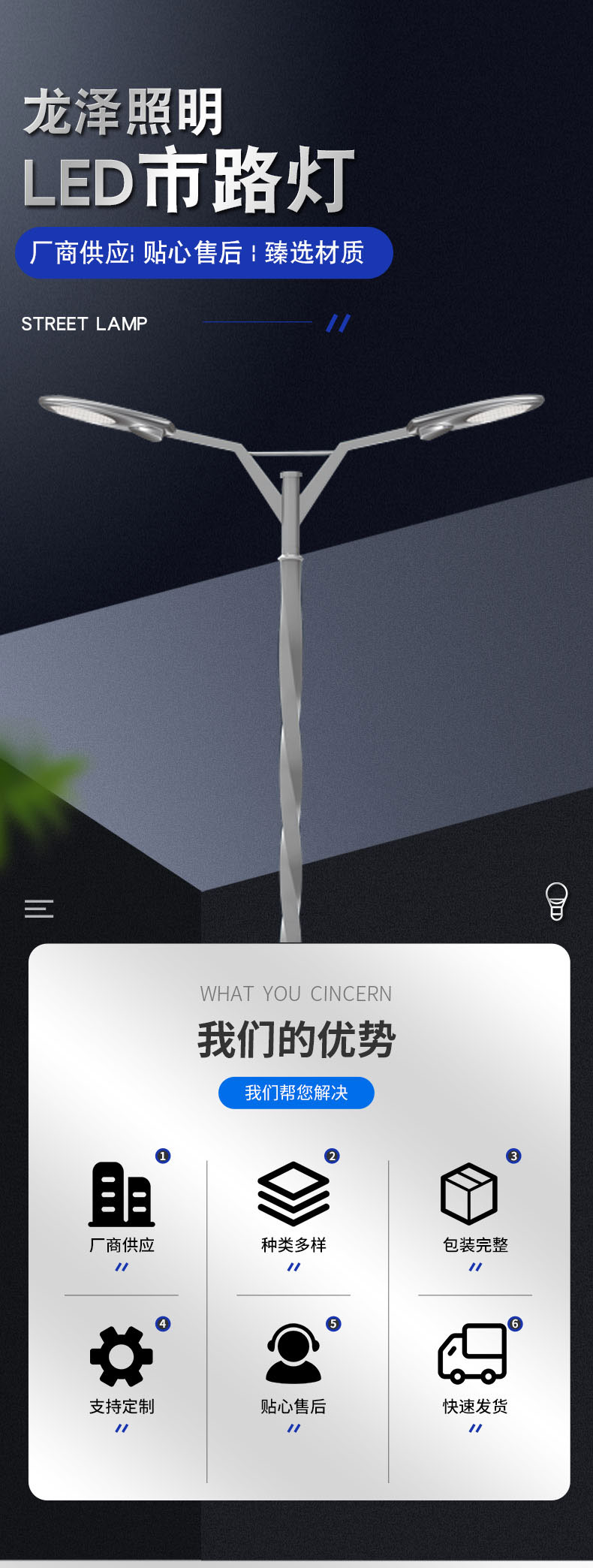 桿件選用寶鋼集團優質Q235型號鋼板,經大型號剪板機下料、1200噸大型壓力機成型后焊接、校直、熱鍍鋅、噴塑而成。 可根據用戶需求生產不同長度、不同規格、不同噴塑色彩的市政路燈!